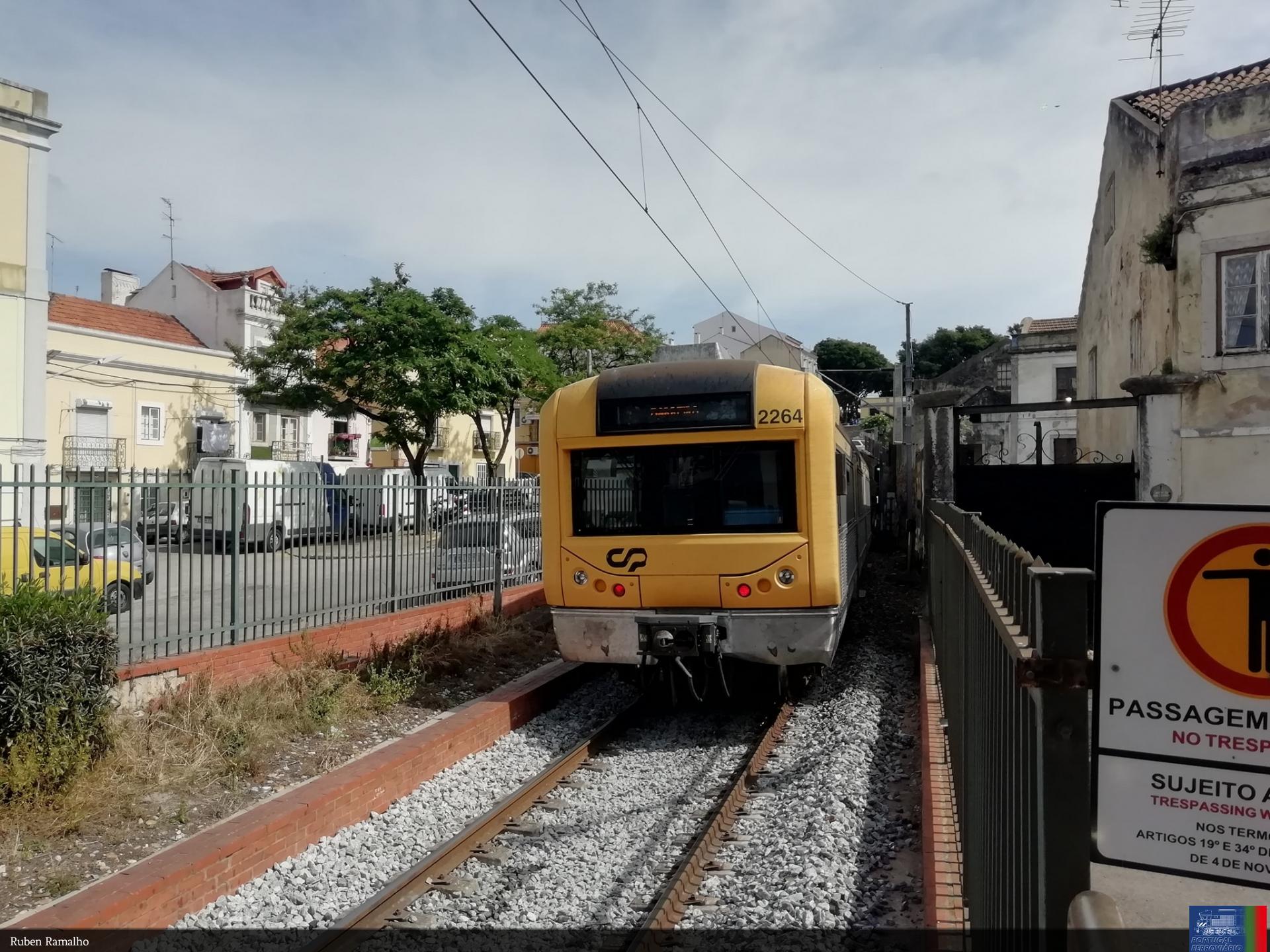 | Descrição | A UTE 2264 à saída do apeadeiro da Praça do Quebedo, com o suburbano 17241 (Barreiro - Praias do Sado-A). 21/05/2021. |