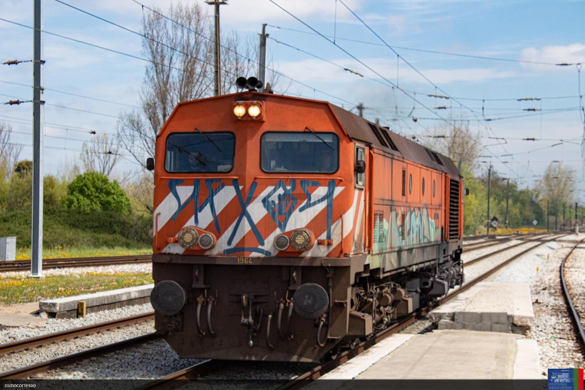 | Descrição | A 1964 regressou ao Entroncamento isolada no marcha 74432, visto que os vagões da Somafel (com carris de barra longa) ainda estavam por descarregar. |