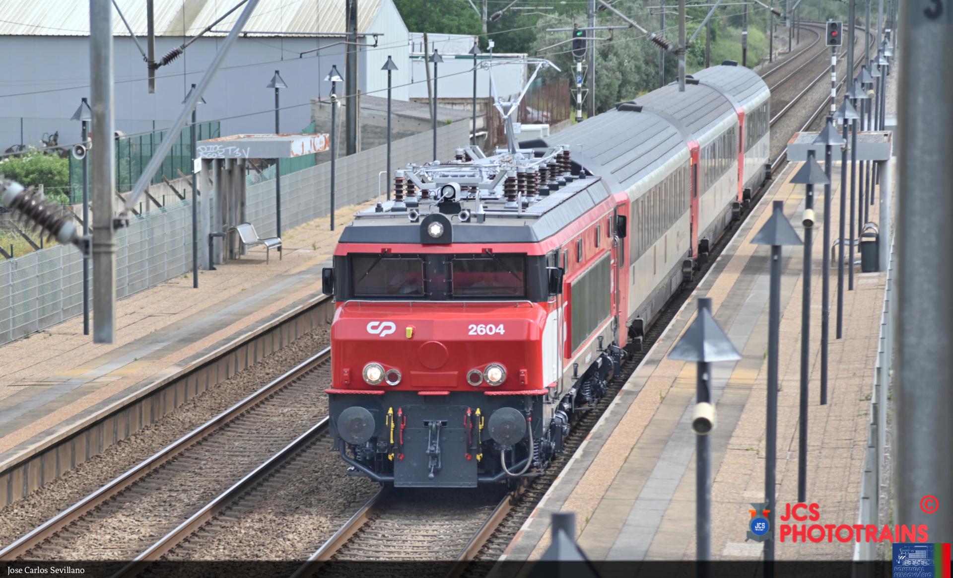 | Descrição | Paso por el apeadero de Aquim de la, recientemente incorporada al servicio activo, locomotora 2604, con los nuevos colores corporativos y un corte de tres coches ex-Renfe, en viaje de pruebas |