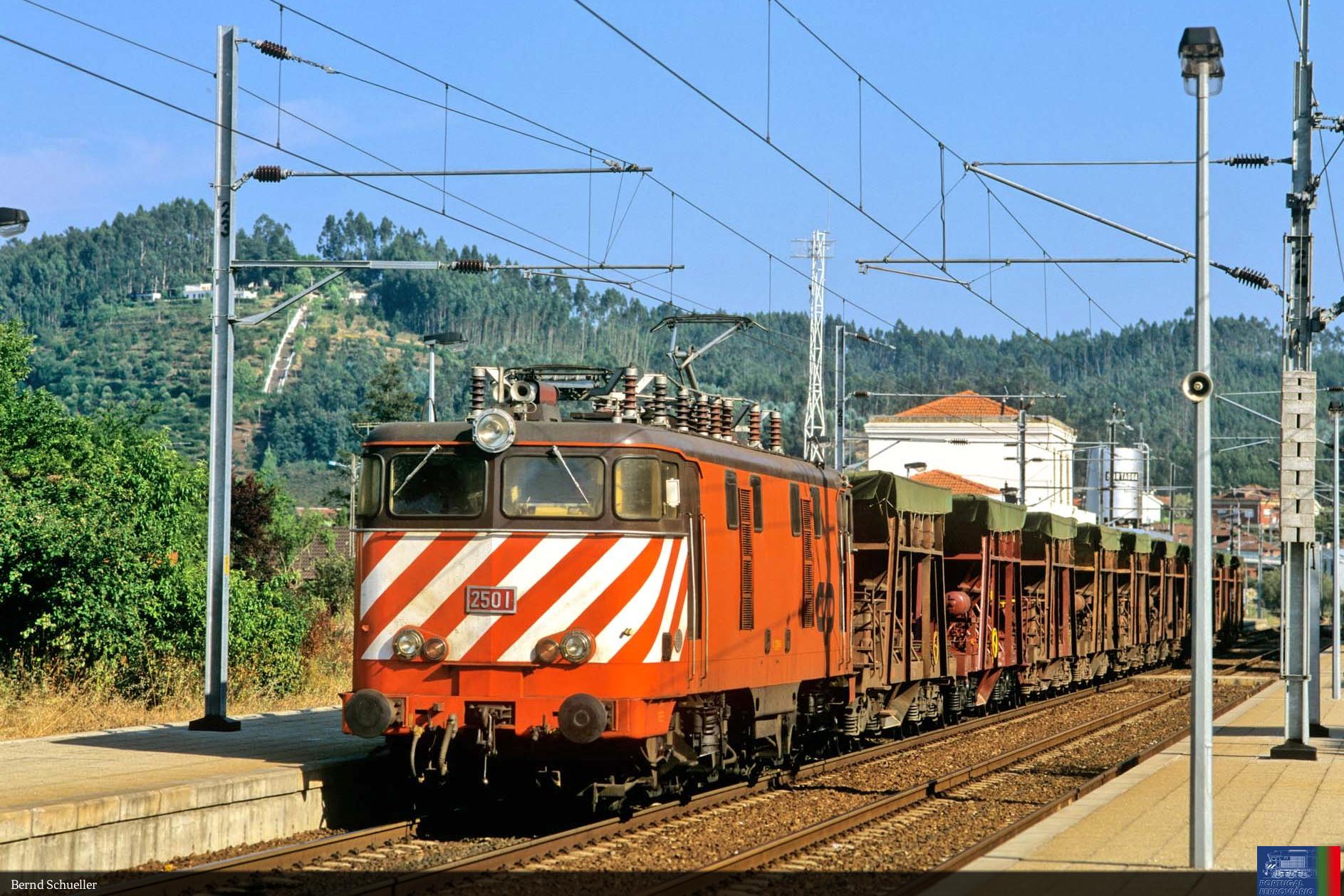 | Descrição | A locomotiva eléctrica 2501 passa pela estação de Mortagua com um comboio de mercadorias a 22 de Abril de 1997. |